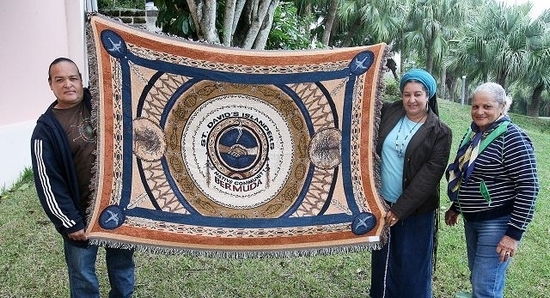 To raise money to further its aims, a trustee of the group, chef and graphic artist Kevin Watson, designed a blanket. Its colors, blue and white, represent the tribes of the northeast and of St. David’s, according to Watson. In the center is the group’s logo, two hands clasping one another, which “represents our reconnection with our relatives in New England after 300 plus years.” The blanket also depicts Bermuda cedar, palmetto, and a longtail bird. In addition there are rockfish, turtles and a marine mollusc called suck-rocks, all of them once used by St. David’s Islanders for food.