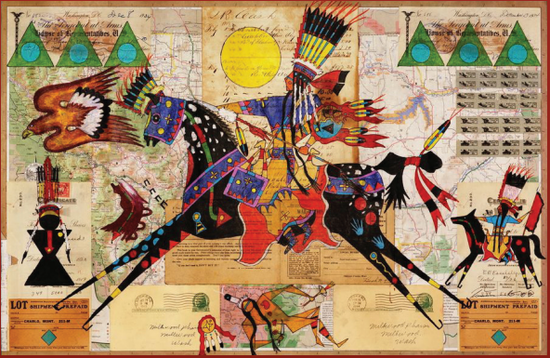 Born in 1959 and currently residing in Norman, Okla., Tom Poolaw works primarily with acrylics and digital images. He was heavily influenced by his grandfather, Horace Poolaw, a photographer.