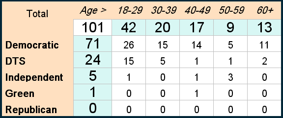 Here’s the good news. I looked at the new voters since 2004 – there being 101 of them all told. And get this! Not a single one of the new voters is a Republican – not one! (DTS = “decline to state”, and means the voter left the party affiliation blank on the registration form; I means they wrote “independent”)