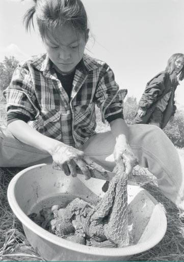 The native people used normal channels for the rulemaking decision on their subsistence moose hunt. (The Cristochina girl on the left is cleaning a moose stomach in a traditional way):