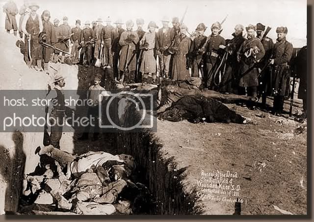 The Sand Creek Massacre and the Washita Massacre both led to the Wounded Knee Massacre. The Sand Creek Massacre brought the realization that “the soldiers were destroying everything Cheyenne – the land, the buffalo, and the people themselves,” and the Washita Massacre added even more genocidal evidence to those facts. The Sand Creek Massacre caused the Cheyenne to put away their old grievances with the Sioux and join them in defending their lives against the U.S. extermination policy. The Washita Massacre did that even more so. After putting the Wounded Knee Massacre briefly into historical perspective, we’ll focus solely on the Wounded Knee Massacre itself for the 117th Anniversary of the Wounded Knee Massacre.