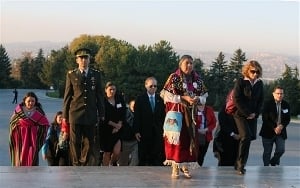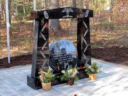 More than 100 Native Americans, veterans and others gathered Saturday at the New Hampshire State Veterans Cemetery to unveil a monument many say is long overdue. The monument, developed and paid for through the efforts of the New Hampshire Intertribal Native American Council, an organization that meets once a month in Laconia, is in the shape of a drum surrounding by an arch. Inscribed in glossy black stone are the words “Dedicated to all Native American Veterans/ American and Canadian / Who served to protect/ This land called/ Turtle Island. “ |