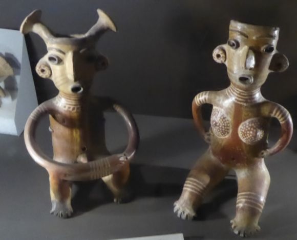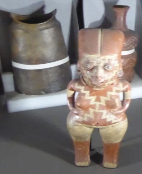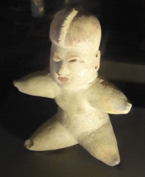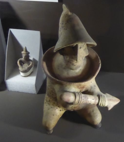 “Figurines, usually hollow, depict warriors, chieftains, females (alone or with children) and people wearing conical headdresses. Statuettes, chunky and having stubbed arms and legs, were also produced, some with shoulder pellets (symbolic designs.”