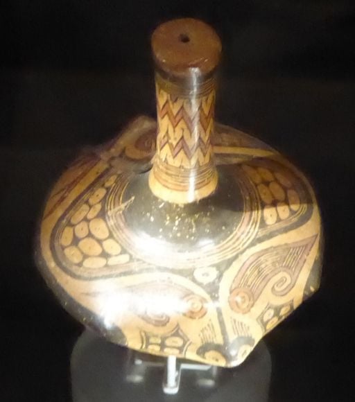 “A stylized stingray encircles the neck of this bottle. Sea creatures were common in pre-Hispanic Central American mythology and are associated with creation stories. Archaeological evidence suggests that stingray spines were widely used in ritual bloodletting in ancient Latin America.”