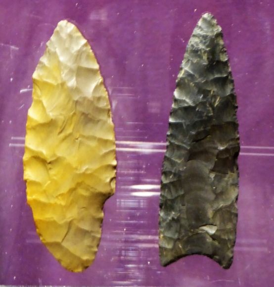 Shown on the left is a Sandia point and on the right is a Clovis point. In the archaeological record, both of these point styles have been associated with the hunting of megafauna.