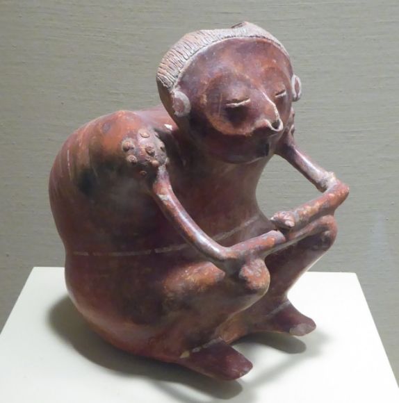 This ceramic figure from Nayarit dates to the Late Formative Period. Notice the interesting nose piece. This piece is on display in the Portland Art Museum.