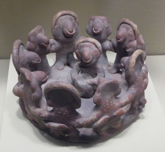 This ceramic piece is from Nayarit. Notice the large nose pieces on the figures. With the drummer seated in the middle, the dancers appear to be engaged in a circle dance. This piece is on display in the Portland Art Museum.