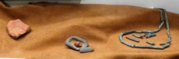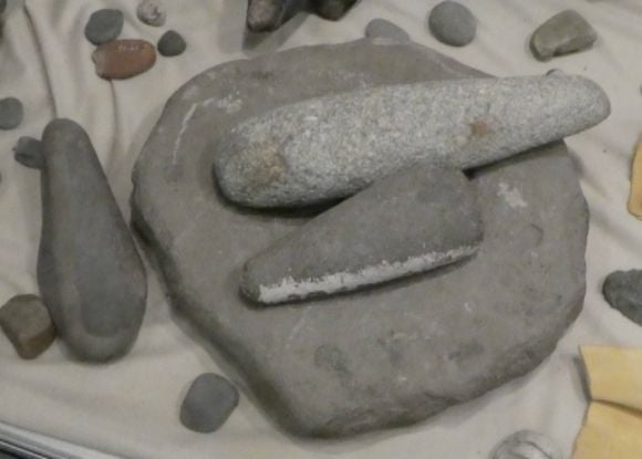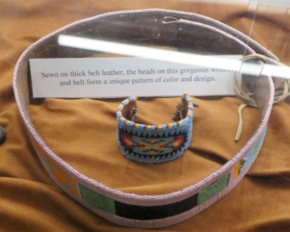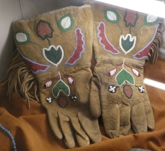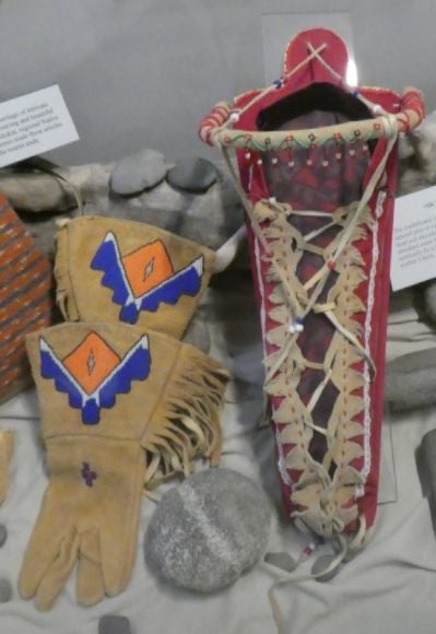 Shown above is a cradleboard (on right), some beaded gauntlets, and a stone hammer head.
