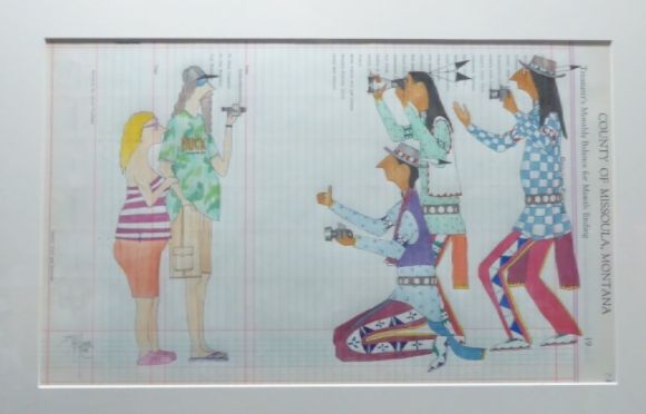 “WOW, Real White People” is the title of this ledger art by Dwayne Wilcox (Oglala and Lakota). This was done in 2014.