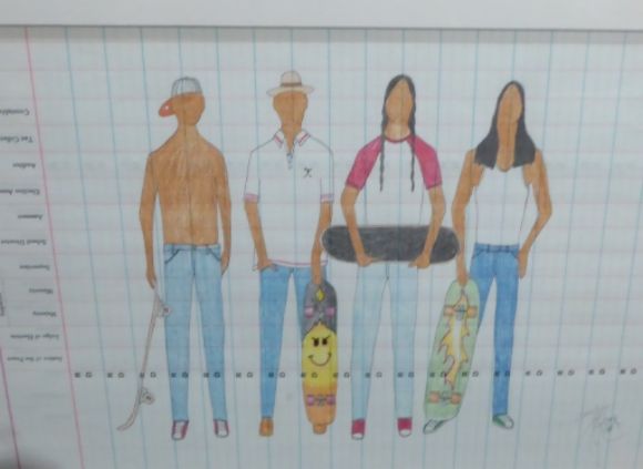 “Four Skins” is the title of this ledger art by Dwayne Wilcox (Oglala and Lakota). This was done in 2014.