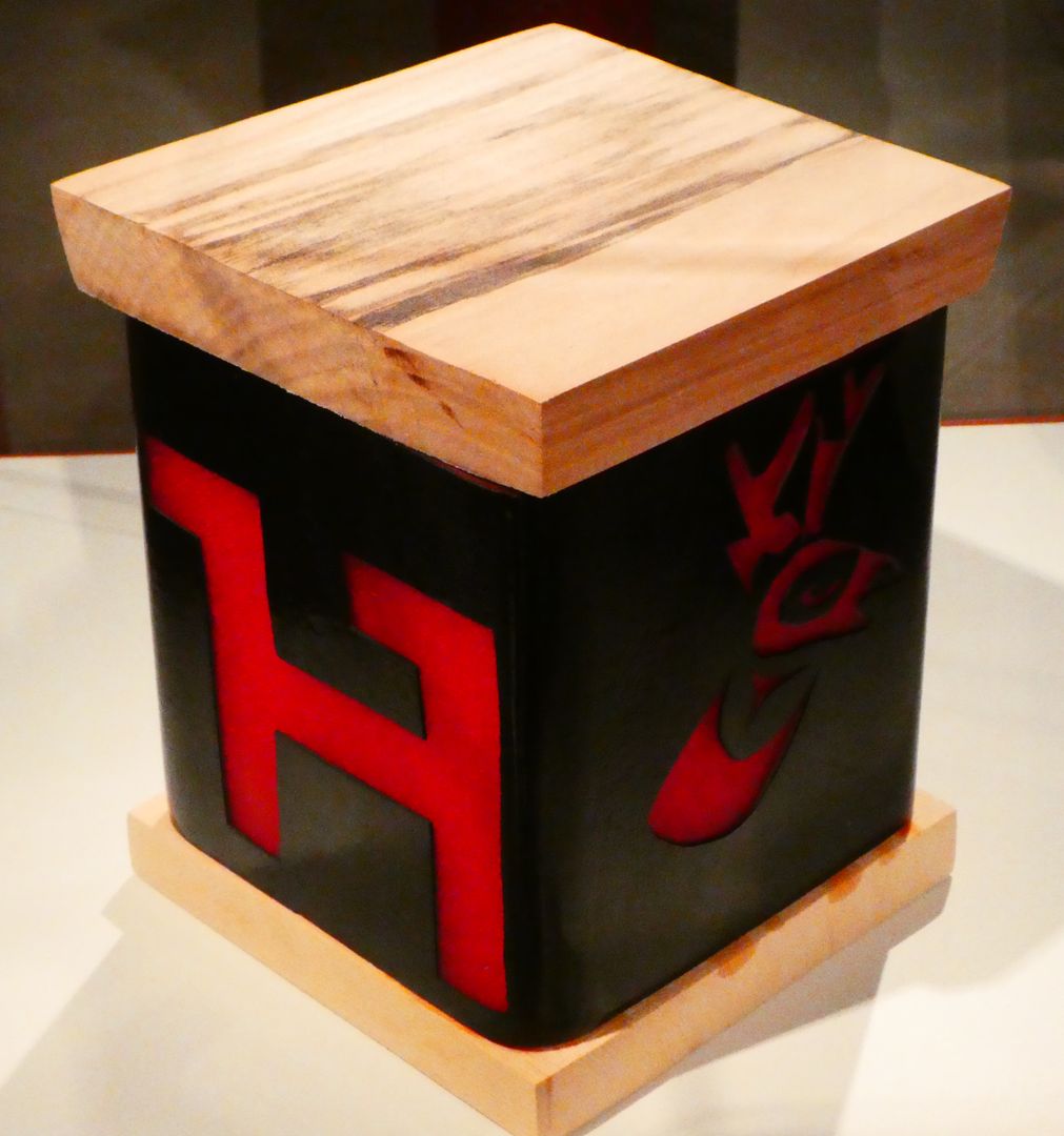 Shown above is taqWitsa (2015). This is blown and sand-carved glass, maple, and yellow cedar.