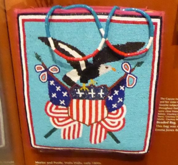 The bandolier horse collar shown above dates to the 1870s. Leona Showaway Smartlowit inherited this Cayuse horse collar from her father’s side of the family.