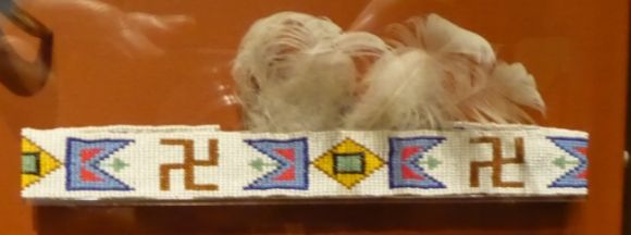 The headband shown above is from the 1930s. It was made by Clarence Burke and presented as a gift to Doris Bounds in 1958. The swastika pattern represents the four winds.