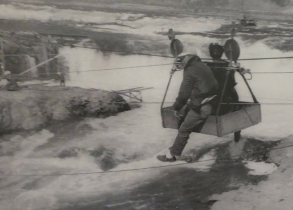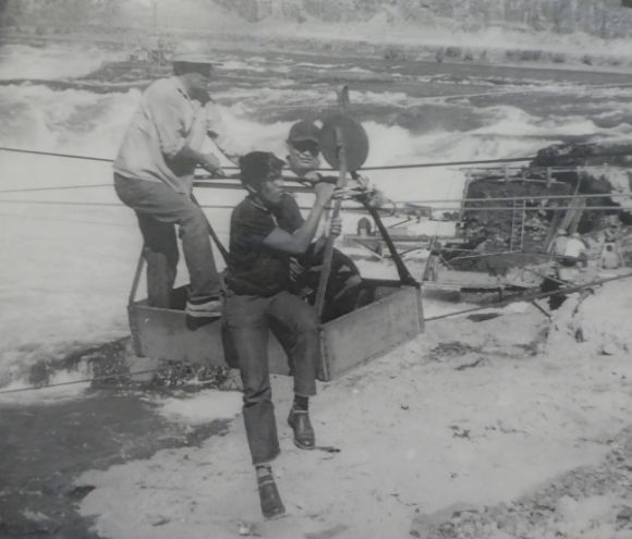 This photograph, taken in 1956, shows fisherman at Celilo Falls riding one of Seufert’s Cableways from the Oregon shore to Chief Island.