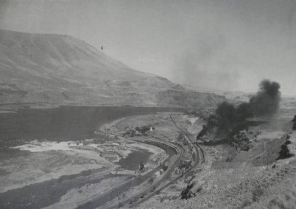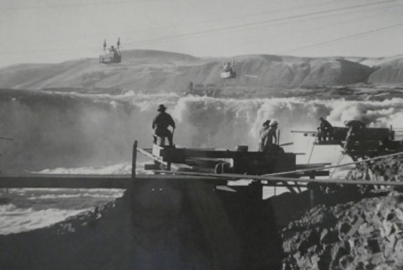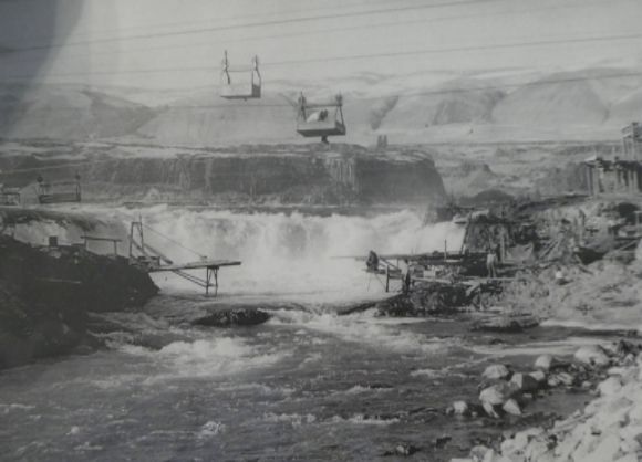 Another view of Celilo Falls in 1947. The smoke is from a steam-power freight train.