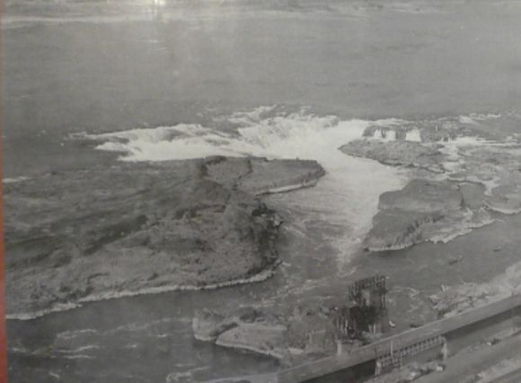 Shown above is Celilo Falls in 1955. A commercial, non-Indian fishwheel can be seen in the lower center of the photograph.