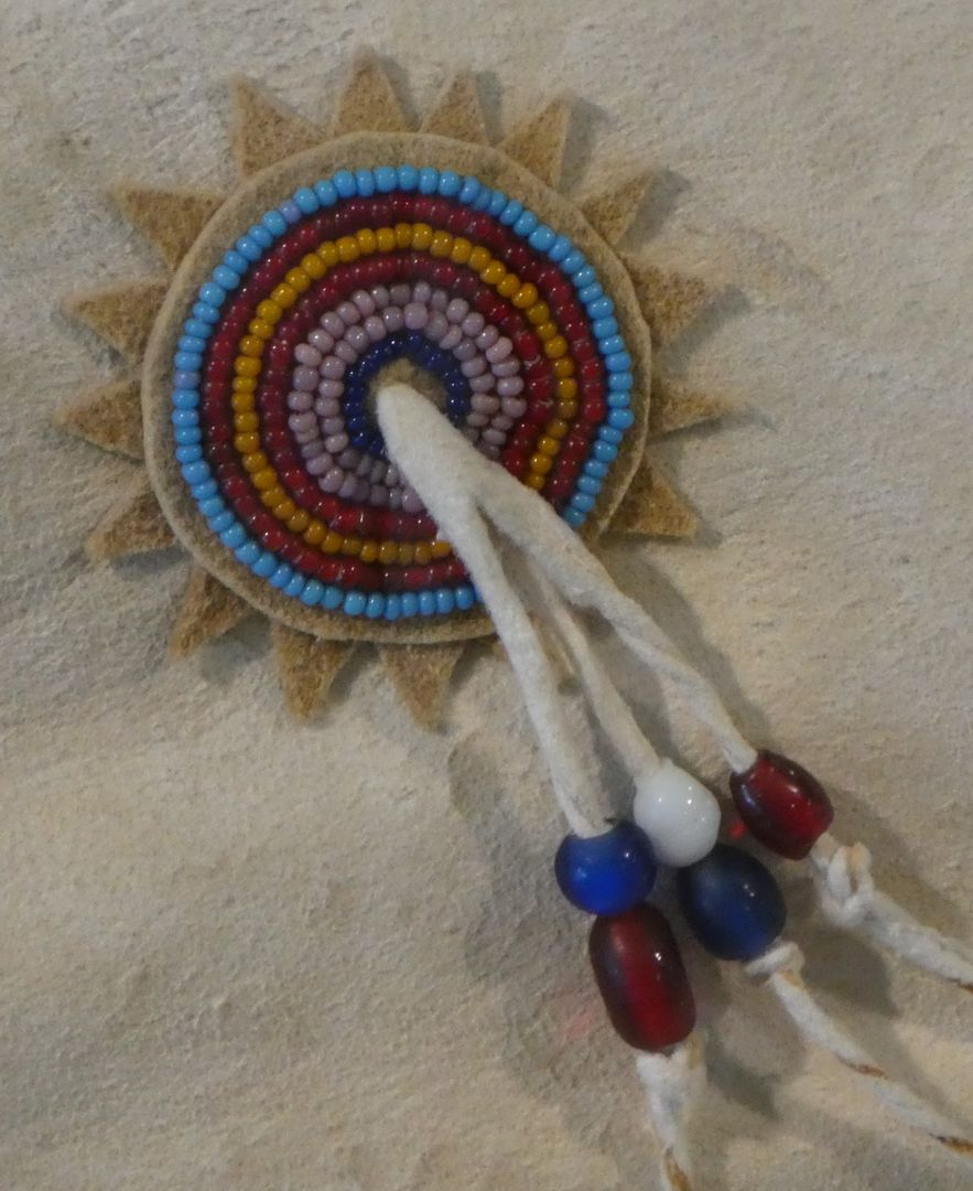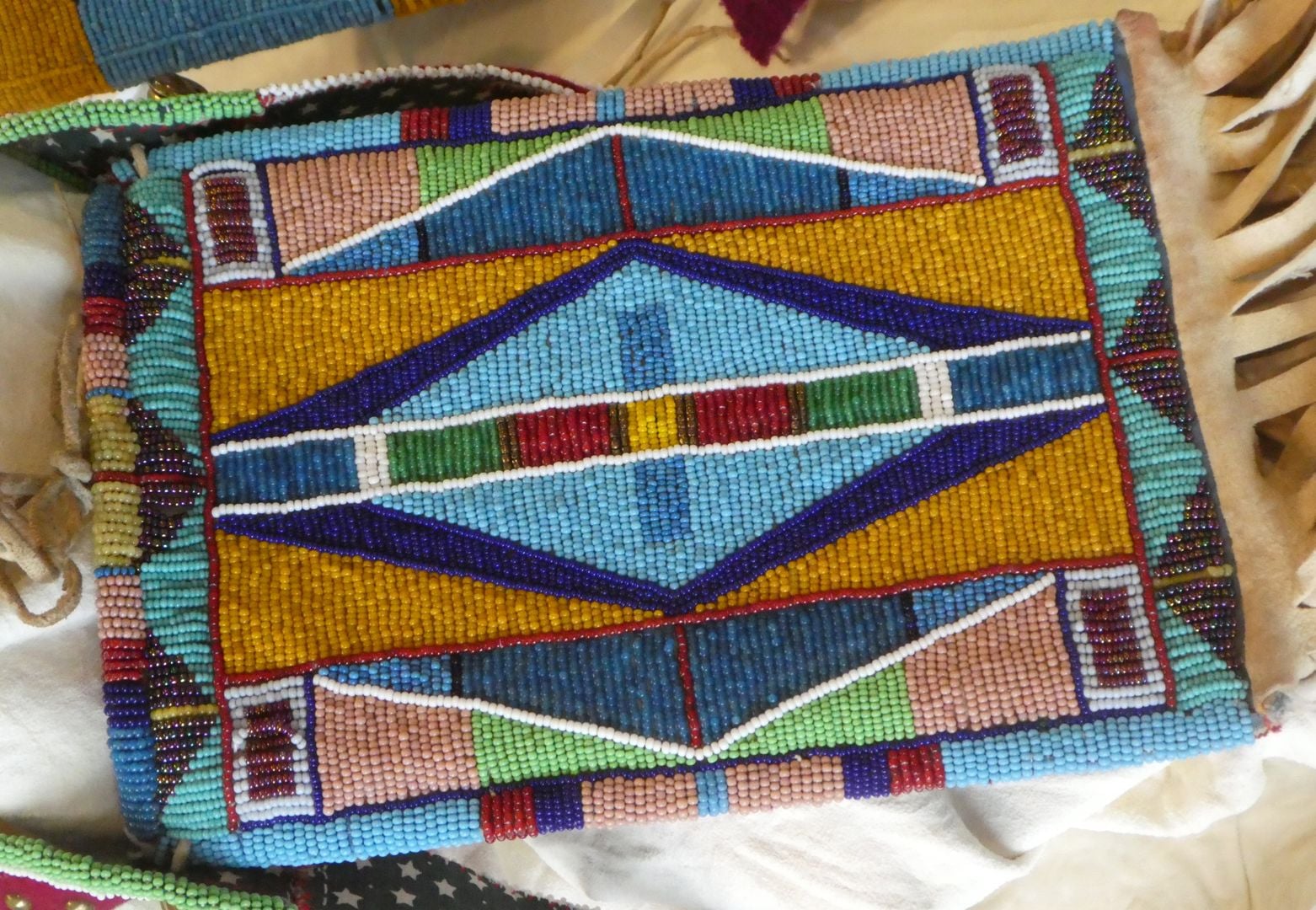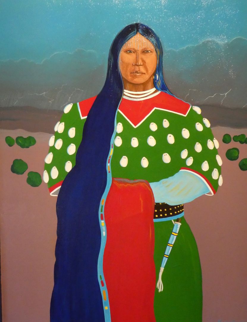 “The dusty pink and cobalt hues are reminiscent of Nez Perce traditional beadwork. The greed and red is common of painted rawhide. This painting brings together these two traditional color spectrums.”
