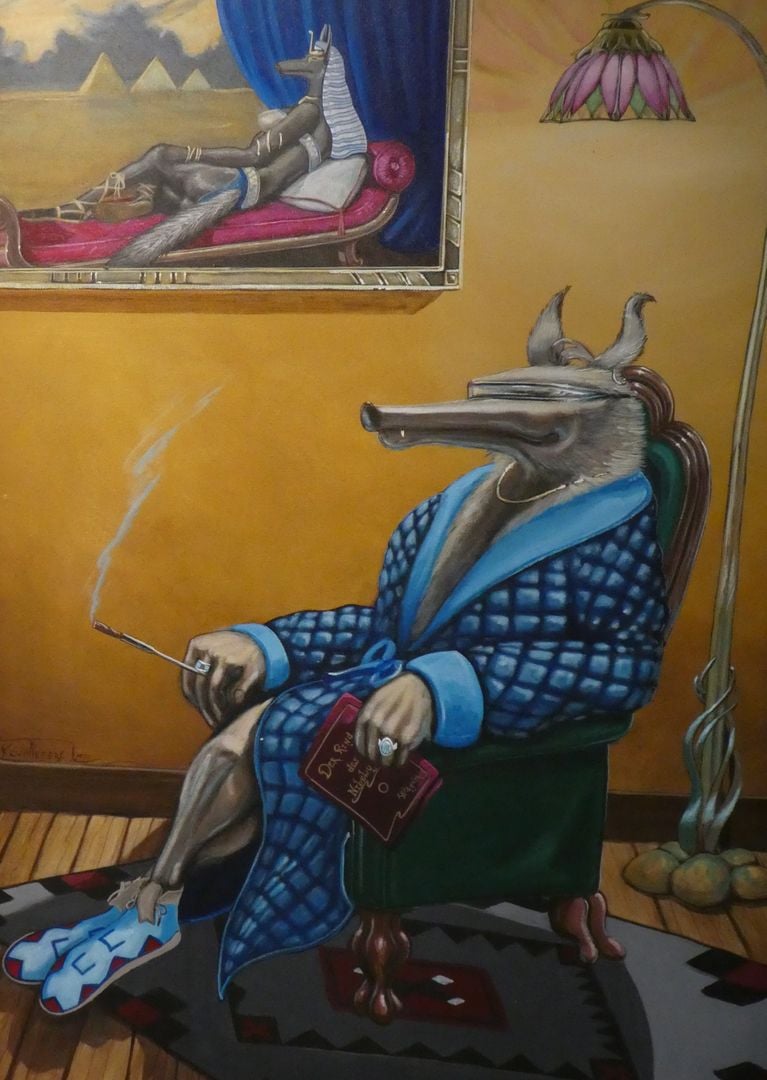 “According to the Nimiipuu (Nez Perce) people, the world before humans was inhabited by animals that possessed human traits. The primary animal was Coyote, called it’se-ye-ye by the Nimiipuu, who at times had superhuman powers. The painting shows a modern perspective on this legendary character.”