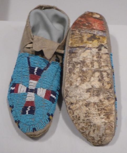 photo P1060816_zpsoptt392e.jpg Shown above are Arapaho moccasins made about 1890. They are decorated with glass beads and are made from recycled parfleche with rawhide soles.  photo P1060818_zps1rdp3rqj.jpg Shown above are Santee Sioux moccasins made about 1890. They are decorated with porcupine quill.