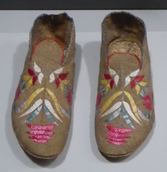 “Ceremonial moccasins were often painted and decorated with fringes and bands of quillwork. Women’s moccasins were cut similar to the men’s, but the ankle flap was more common on the women’s.”