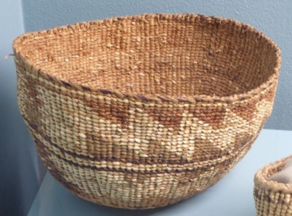 “Baskets from this region are woven in many varieties of twining, some with designs in simple bands, while others are more complex.”