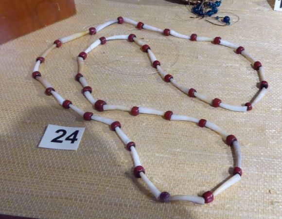 The slender, white, tusk-shaped shells used as beads are dentalium, which is harvested on the west side of Vancouver Island in present-day British Columbia and which were traditionally traded along the coast. Strings of dentalium often functioned as a kind of money. In his book The Indians of Yaquina Bay, E. Wayne Courtney reports:
