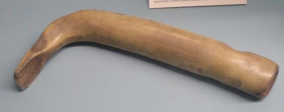 Shown above is a scraper made from elk antler. This would have been used in processing animal skins to remove flesh and hair. This scraper once had a metal blade attached to it.