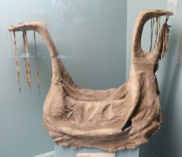 Shown above is a Crow woman’s saddle. It was made with a cottonwood frame covered with buckskin.
