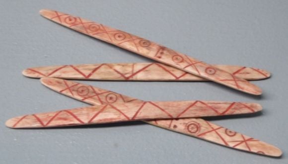 Shown above are some game sticks. These are made from buffalo bone. Game sticks, in sets of four, are used like dice.