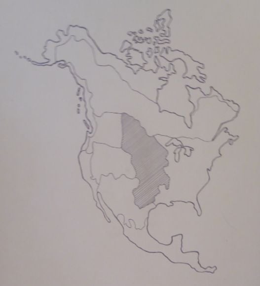 The Great Plains is the huge area in the central portion of the North American continent which stretches from the Canadian provinces in the north, almost to the Gulf of Mexico in the south, from the Rocky Mountains in the west to the Mississippi River in the east. This is an area which contains many different kinds of habitat: flatland, dunes, hills, tablelands, stream valleys, and mountains. It is a dry region and lacks trees except along rivers and streams.