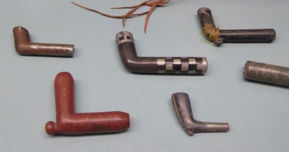 Stone pipe bowls are shown above. Several of them have been decorated with lead.