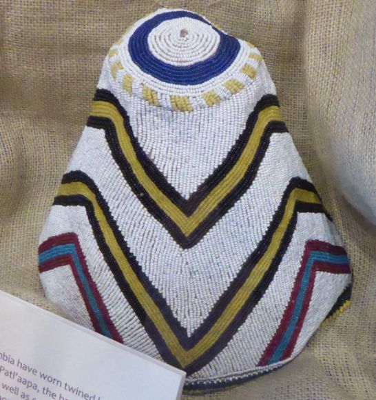 “Native women of the Mid-Columbia have worn twined basketry hats for generations. Known as Patl’aapa, the hats provided protection from the elements, as well as comfort for cradle boards and gathering basket support straps worn around the forehead. The hats distinguished social hierarchy and expressed personal or family identity. As the tradition of basket making diminished, the basketry hat became a symbol of heritage reserved for special occasions.”