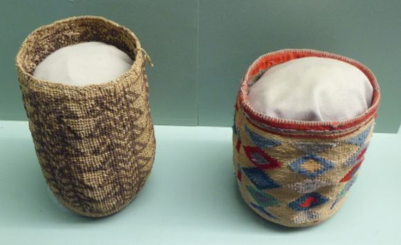 Round twined bags, such as those shown above, were used in gathering and storing roots and other foods. These bags varied greatly in size and the designs which decorate them range from simple bands to complex geometric patterns.