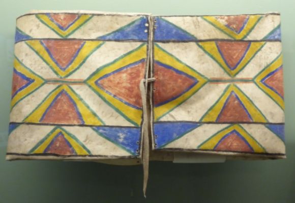 Throughout the Plateau, Plains, and Great Basin culture areas, Indian people used containers made of painted rawhide for storage. According to the Museum display: