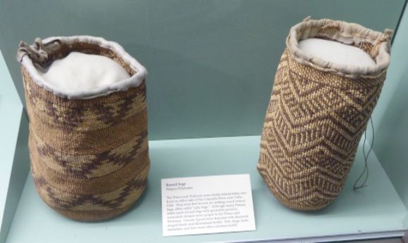 The round bags shown above are Wasco-Wishxam, two closely related tribes who lived on either side of the Columbia River near Celilo Falls. Naturalistic designs were unique to the Wasco and Wishxam.