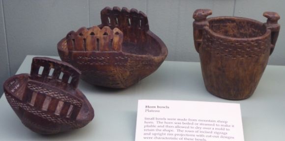 “Small bowls were made from mountain sheep horn. The horn was boiled or steamed to make it pliable and then allowed to dry over a mold to retain the shape. The rows of zigzags and upright rim projections with cut-out designs were characteristic of these bowls.”