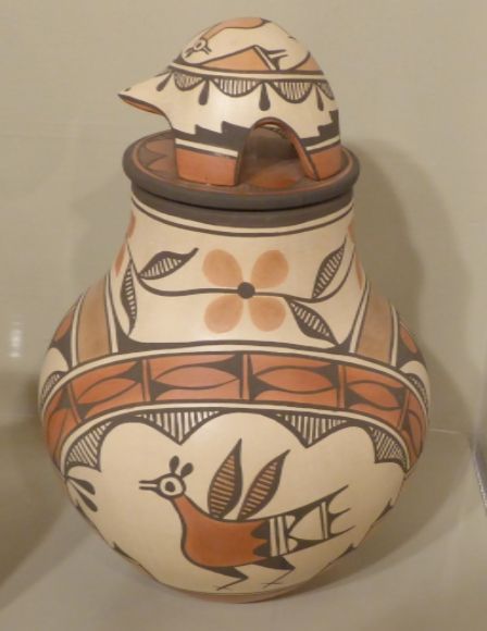 Shown above is a lidded pot by Jemez/Zia potter Elizabeth Medina. This piece was made about 2015. Elizabeth Medina was born into Jemez Pueblo and married into Zia Pueblo.