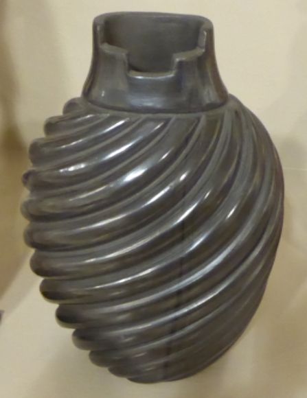 Shown above is a black swirl melon jar with kiva step opening by Jemez potter Emma Yepa. This piece was made in 2015.