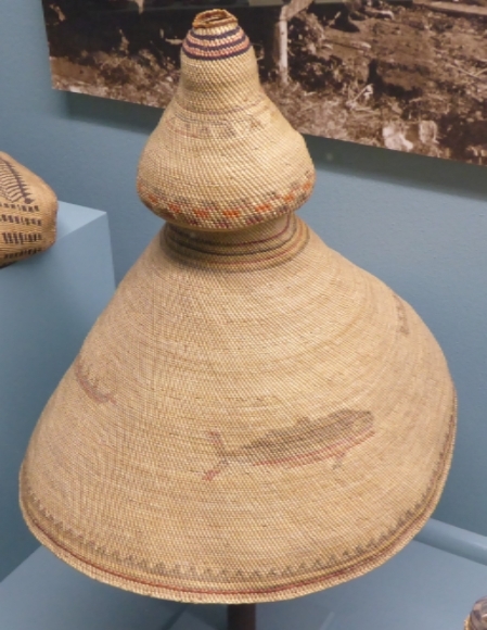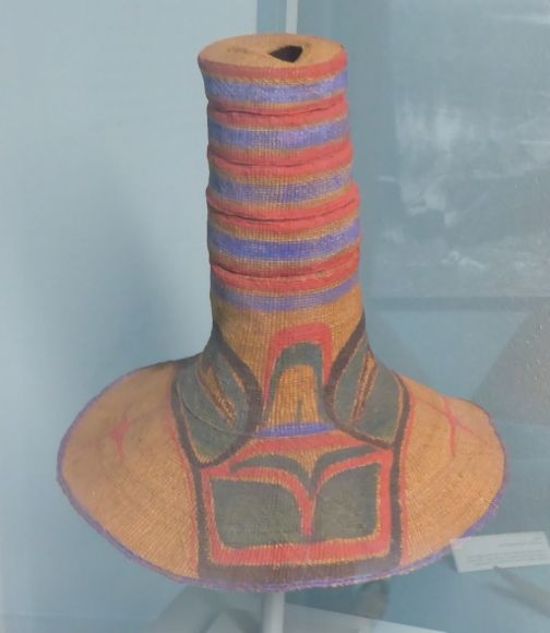 Shown above are basketry hats with painted designs. The rings added to the crown of the hat indicate that the owner had held a potlatch.