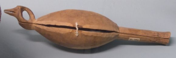 “Bird shapes were common in Northwest Coast rattles and this example is typical of the West Coast style. Two separate pieces were carved and tied together with pebbles inside. Rattles were an important accessory during ceremonial dances.”