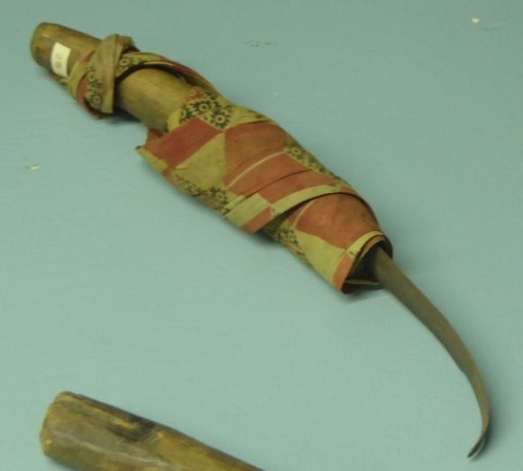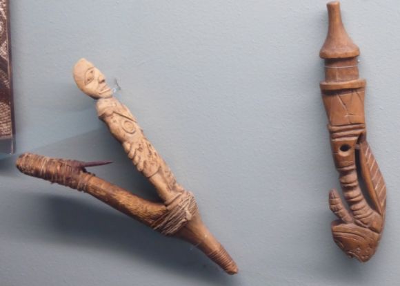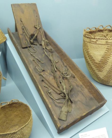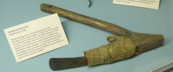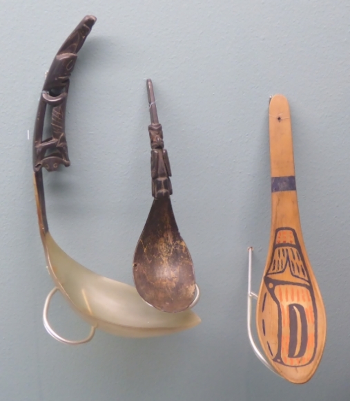photo P1090304_zpsckwpanzf.jpg Knife handles were often carved with a crest figure like the raven shown above.  photo P1090310_zpsgragmonc.jpg Wood carving was important and a highly-developed skill among Northwest Coast peoples. The elbow adze shown above was used for roughing out shapes as well as for finishing the surface of boards.  photo P1090311_zpsjdzdcgmr.jpg Shown above is another woodworking tool.  photo P1090327_zps0owwakjp.jpg Shown above are Haida halibut hooks.  photo P1090333_zpsadaqjv7n.jpg Spoons were traditionally made from wood and horn. Wooden spoons often had carved or painted designs. The small black spoon is made from mountain goat horn.