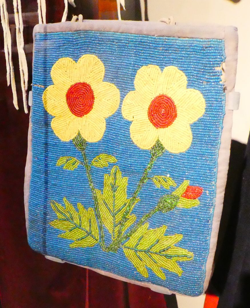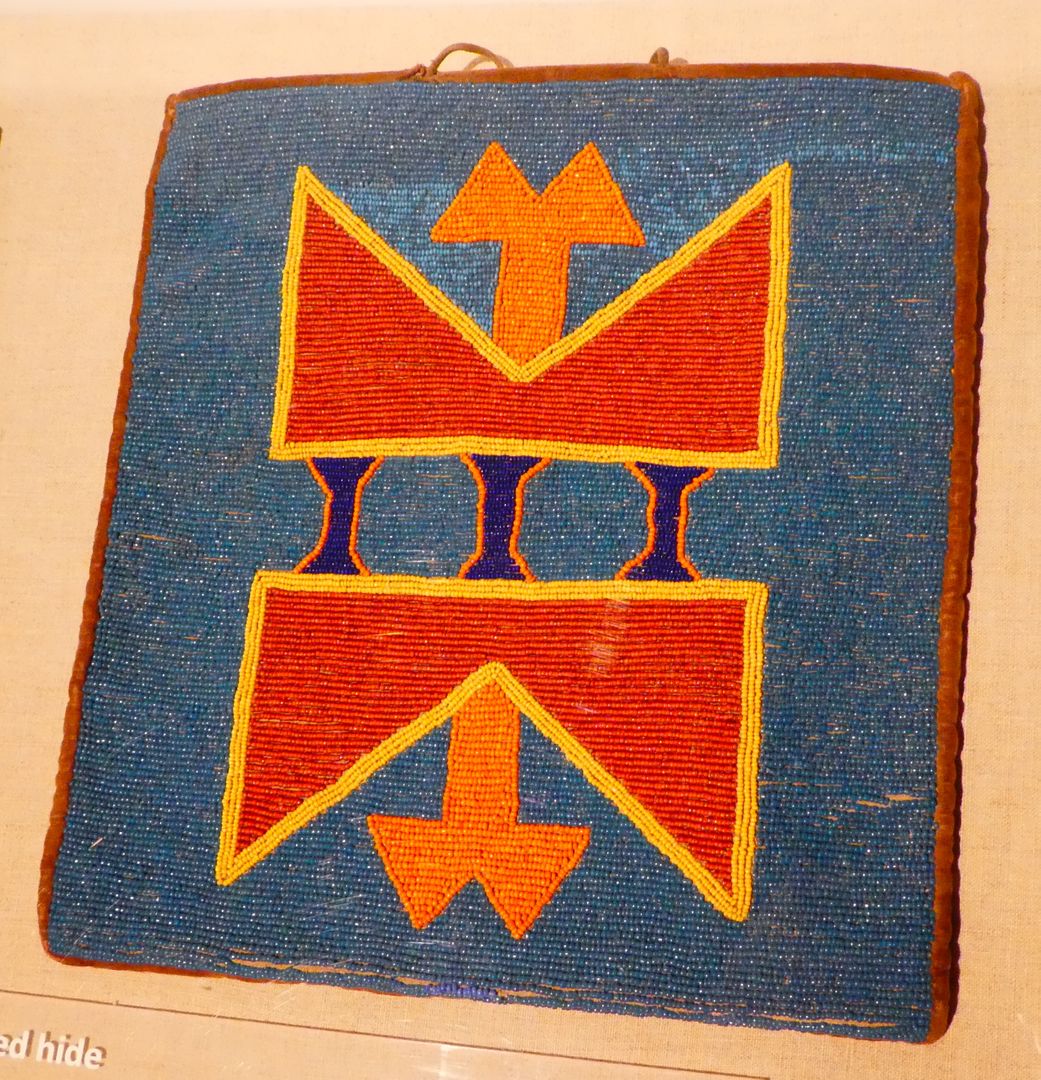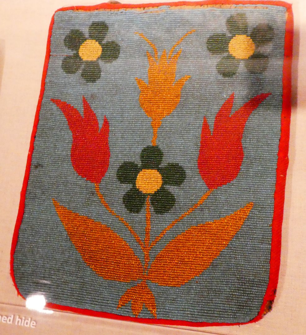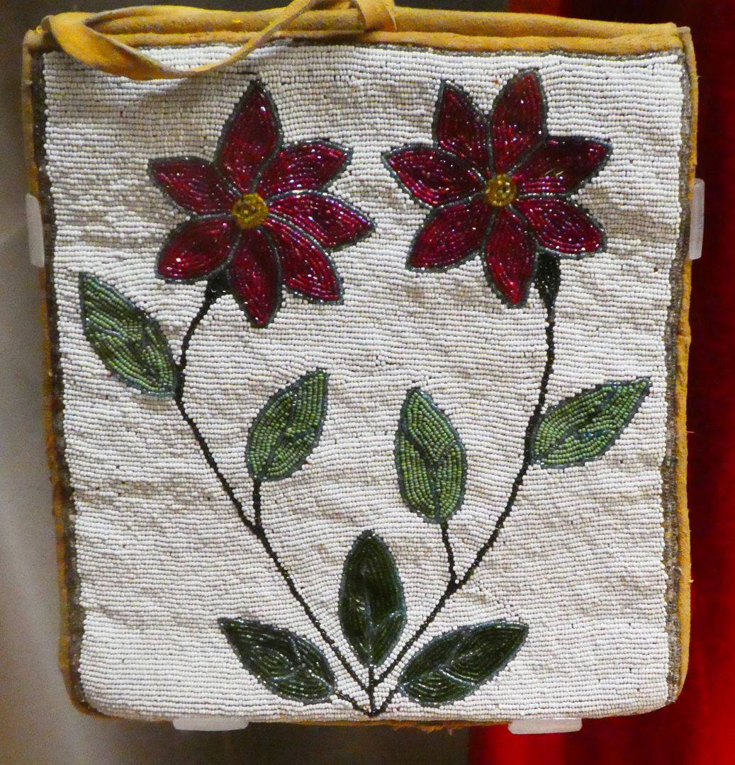 One of the displays in this special exhibit presented some beaded bags. Glass beads were introduced to American Indian cultures during the fur trade and were soon adapted to traditional Indian designs. The use of beads did not result in any Europeanization of art styles. In his book Native Arts of North America, Christian Feest writes: