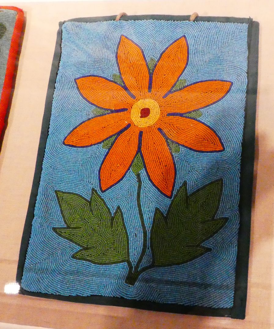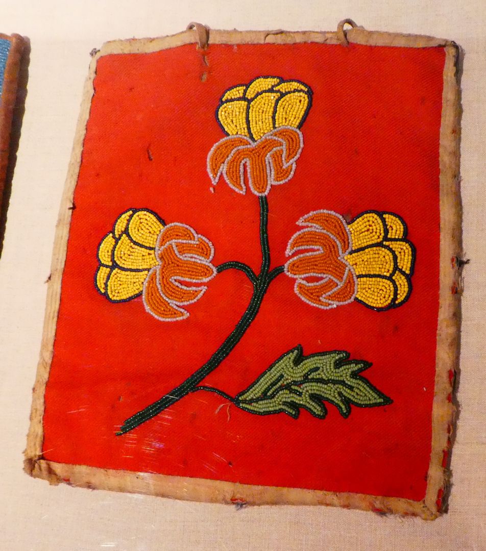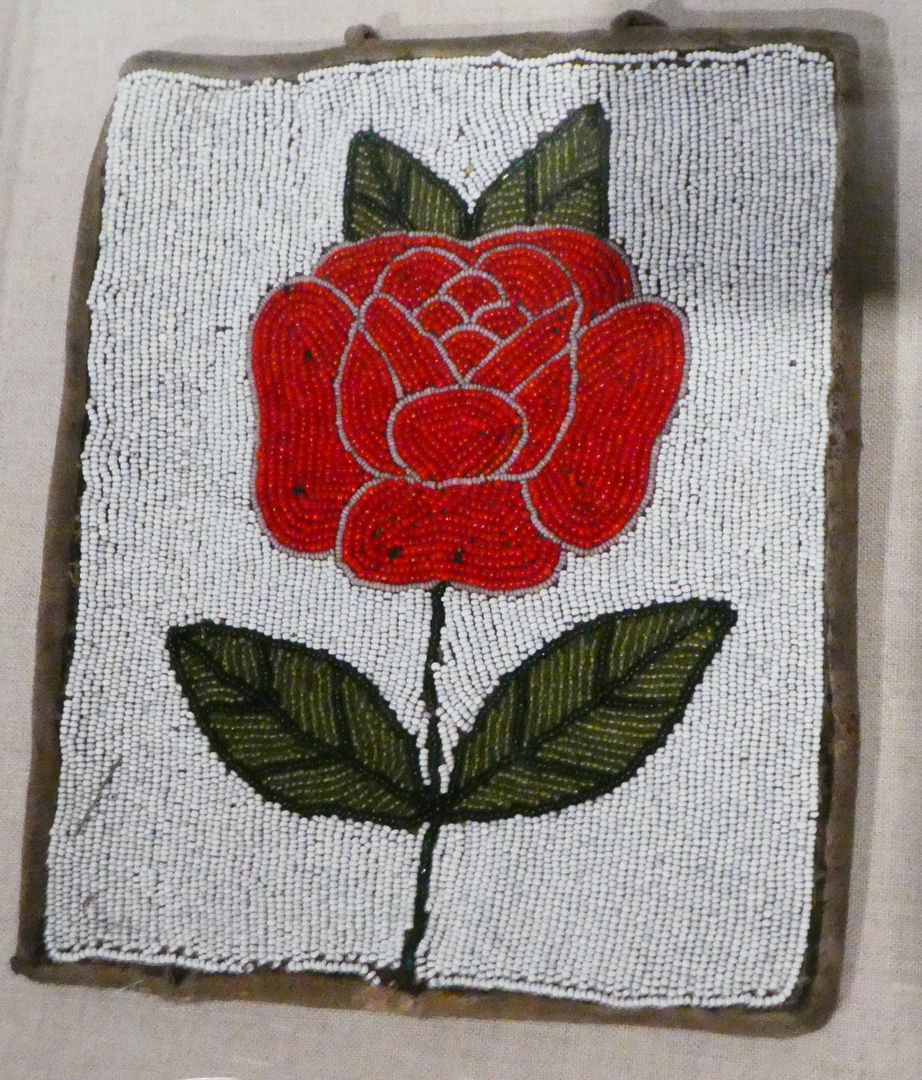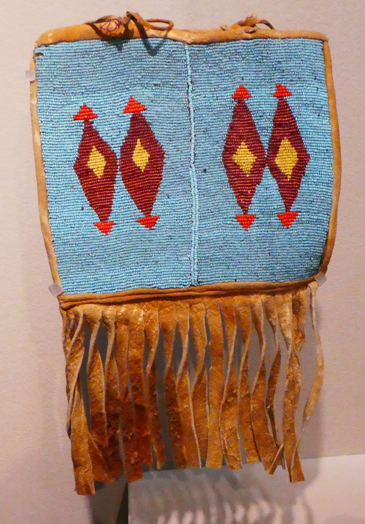 One of the displays in this special exhibit presented some beaded bags. Glass beads were introduced to American Indian cultures during the fur trade and were soon adapted to traditional Indian designs. The use of beads did not result in any Europeanization of art styles. In his book Native Arts of North America, Christian Feest writes: