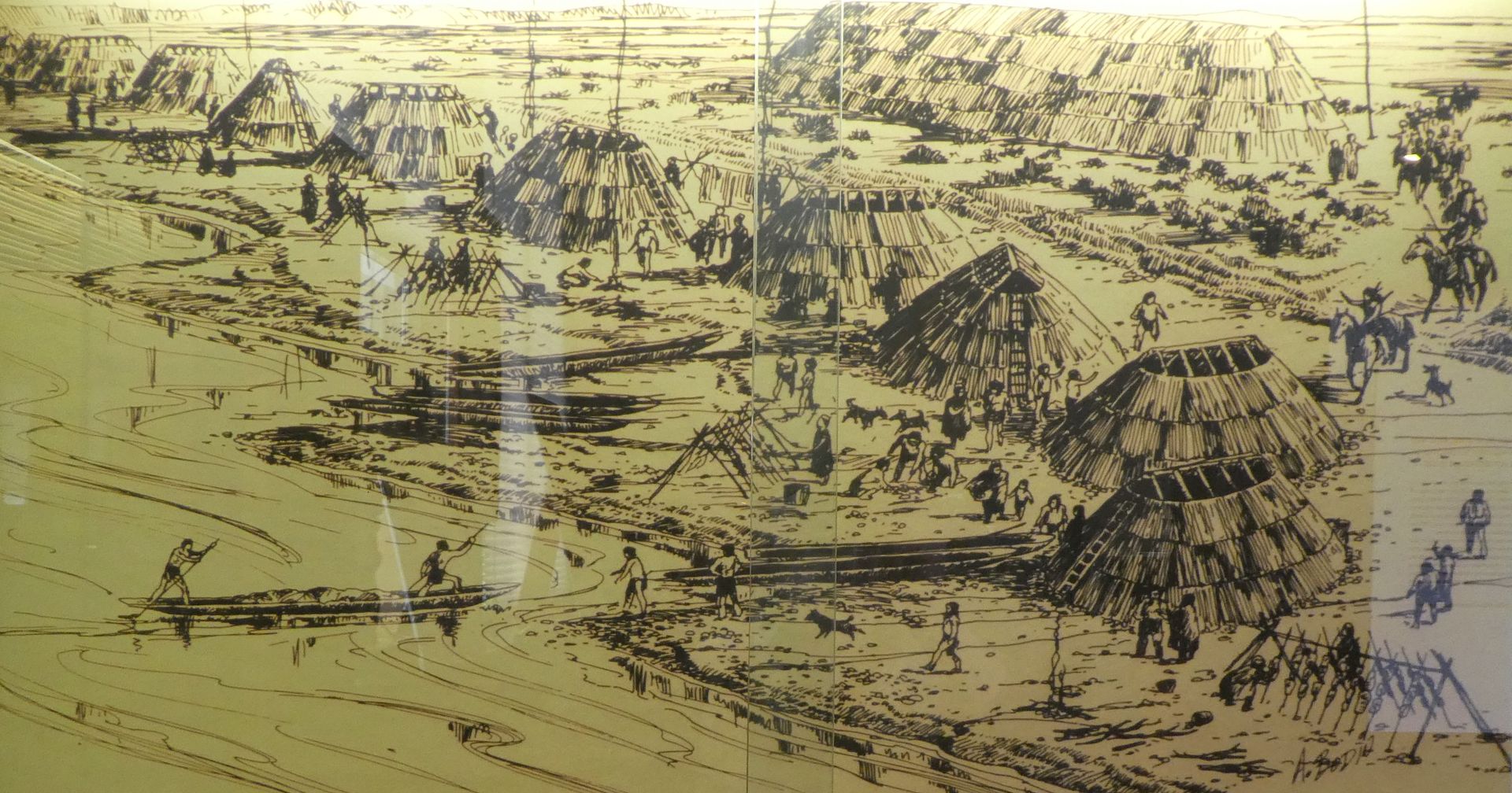 Shown above is a depiction of a Wanapan village. The lodges are made using tule mats—woven from dried reeds and stitched together. The tule mats provided excellent insulation during the fall and winter months.