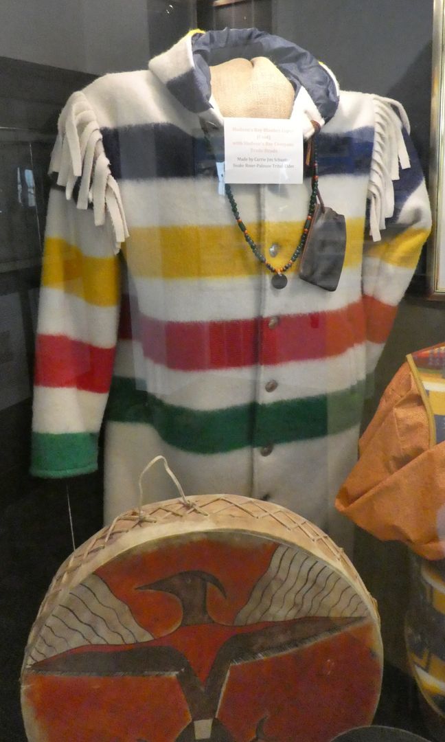 Shown above is a coat made from a Hudson’s Bay Company trade blanket and a hand drum.