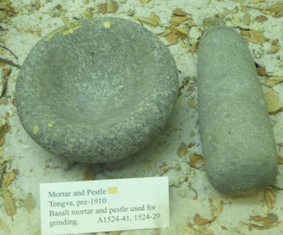 Shown above is a Tongva mortar and pestle which was used for grinding seeds and nuts. These were made prior to 1910.