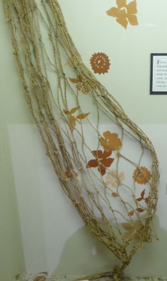 Shown above is a Cahuilla carrying net which was used to gather food such as cactus pads. This net, made about 1900, was made from milkweed fibers.