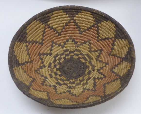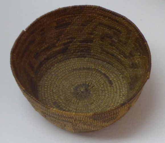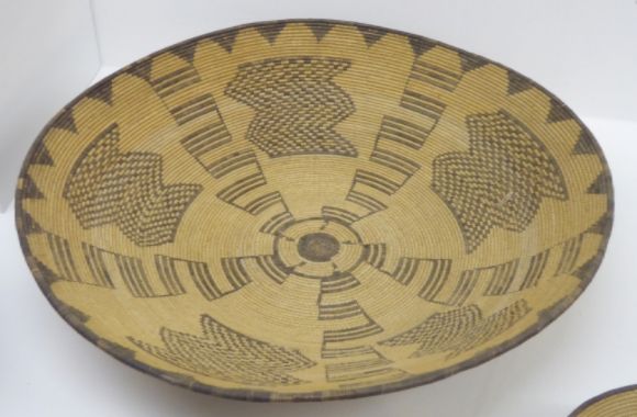 “Akimel O’odham (Pima) and Tohono O’odham (Papago) baskets are very similar. Akimel O’odham weaving was historically the finer and more intricate of the two. Tohono O’odham baskets have large, somewhat flattened coils and bolder, less detailed designs. Geometric patterns—particularly arrangements of concentric lines—frequently appear. Representations of human beings, deer and other animals are also common. Bowls and trays were historic forms but other shapes were created for sale to outsiders.”