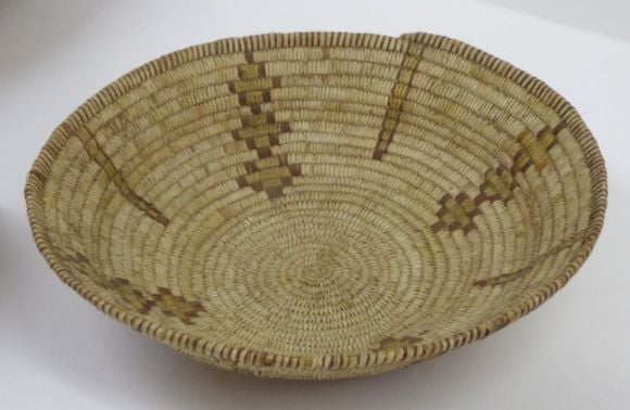 “Among the Mescalero Apaches, coiled baskets were usually made with a two-rod or a bundle of sumac, sewn with split yucca. The white background was made from bleached yucca, while the green or yellow elements were made from unbleached portions of the plant. Red-brown accents utilized yucca roots. Geometric patterns and star shapes are common design elements.”