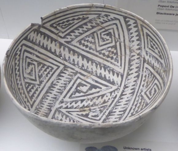 “The Black-on-black technique involves an initial overall polishing of the vessel with red slip. Then, using a thinned mixture of slip, designs are painted over the polished surface. Before the firing the jar is a matte red-brown on polished red, and after the firing the more recognizable matte and polished black.”